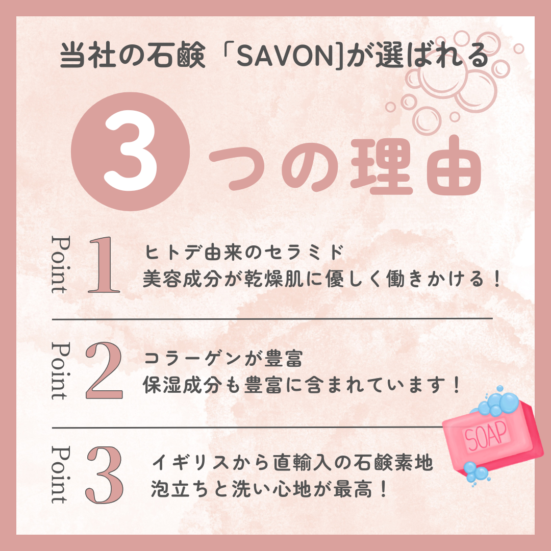洗顔石鹸として化粧品登録されている固形石鹸「SAVON」は、全身用石鹸として創られました。