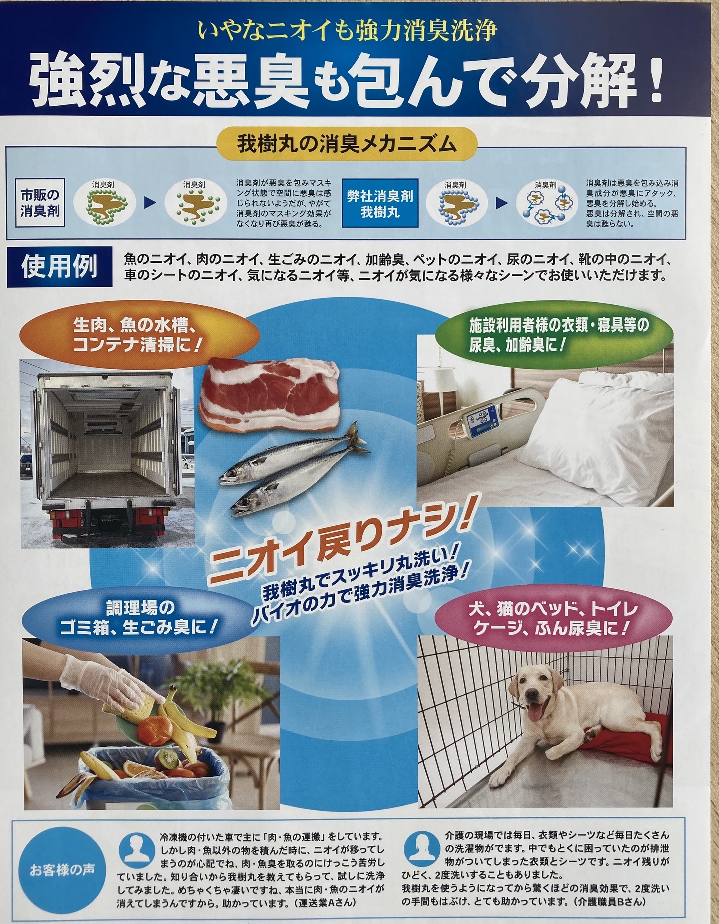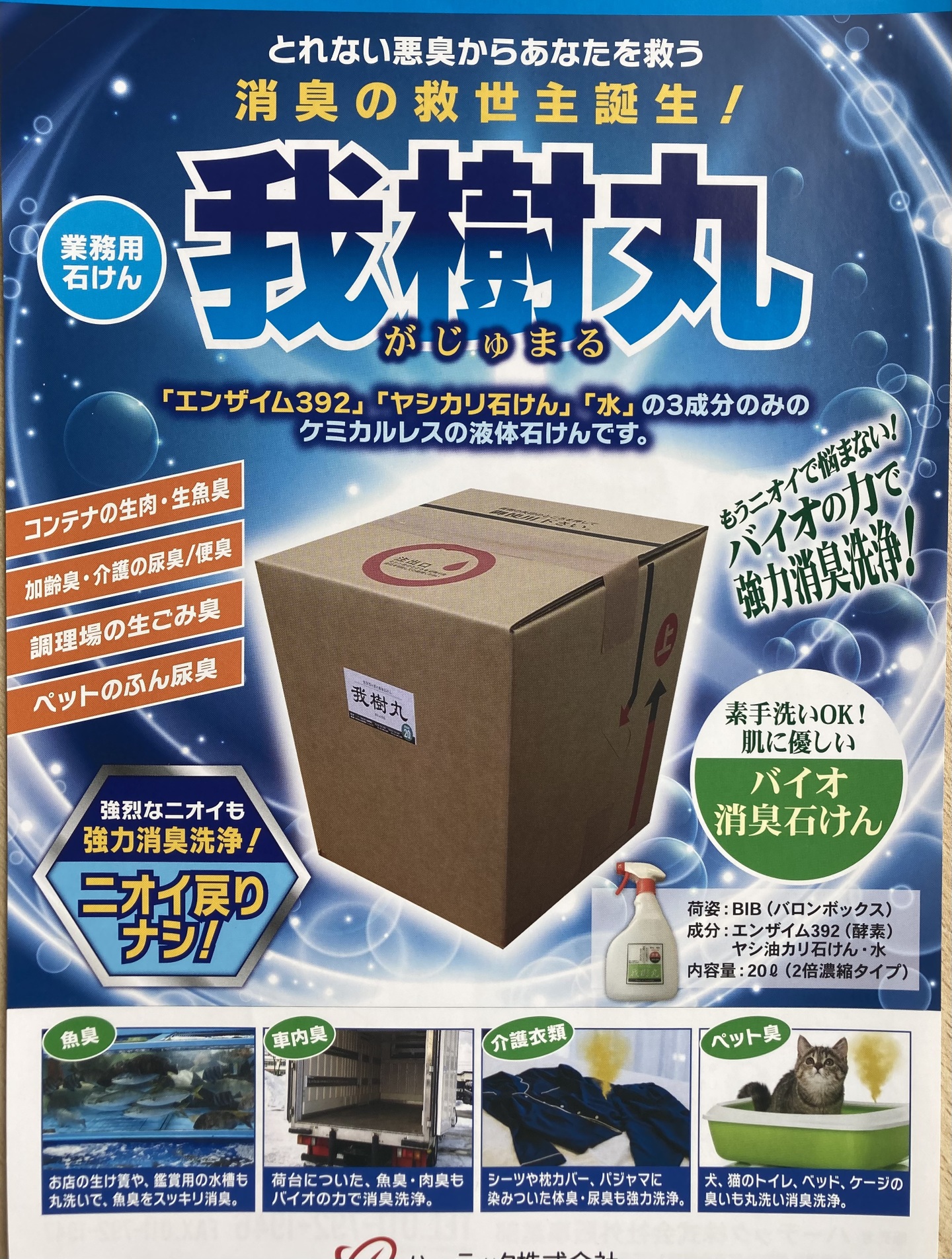 「落とすのが困難な『生物臭』を根絶する。」特殊清掃や食品物流の現場で欠かせないプロユース製品となっています。