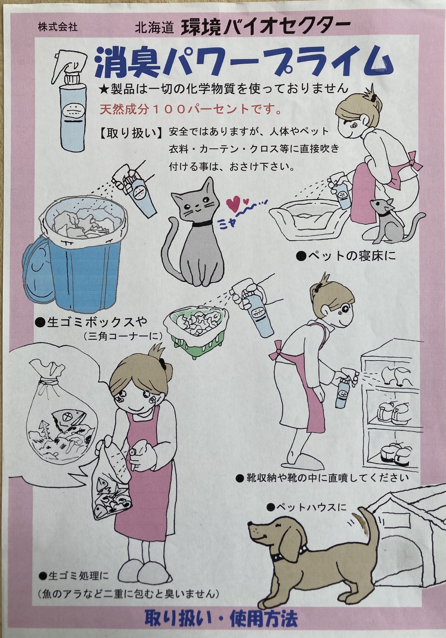 ペット(犬・猫)周辺で使用する際は、直接舐めることがないよう、高い位置への噴霧を推奨します。